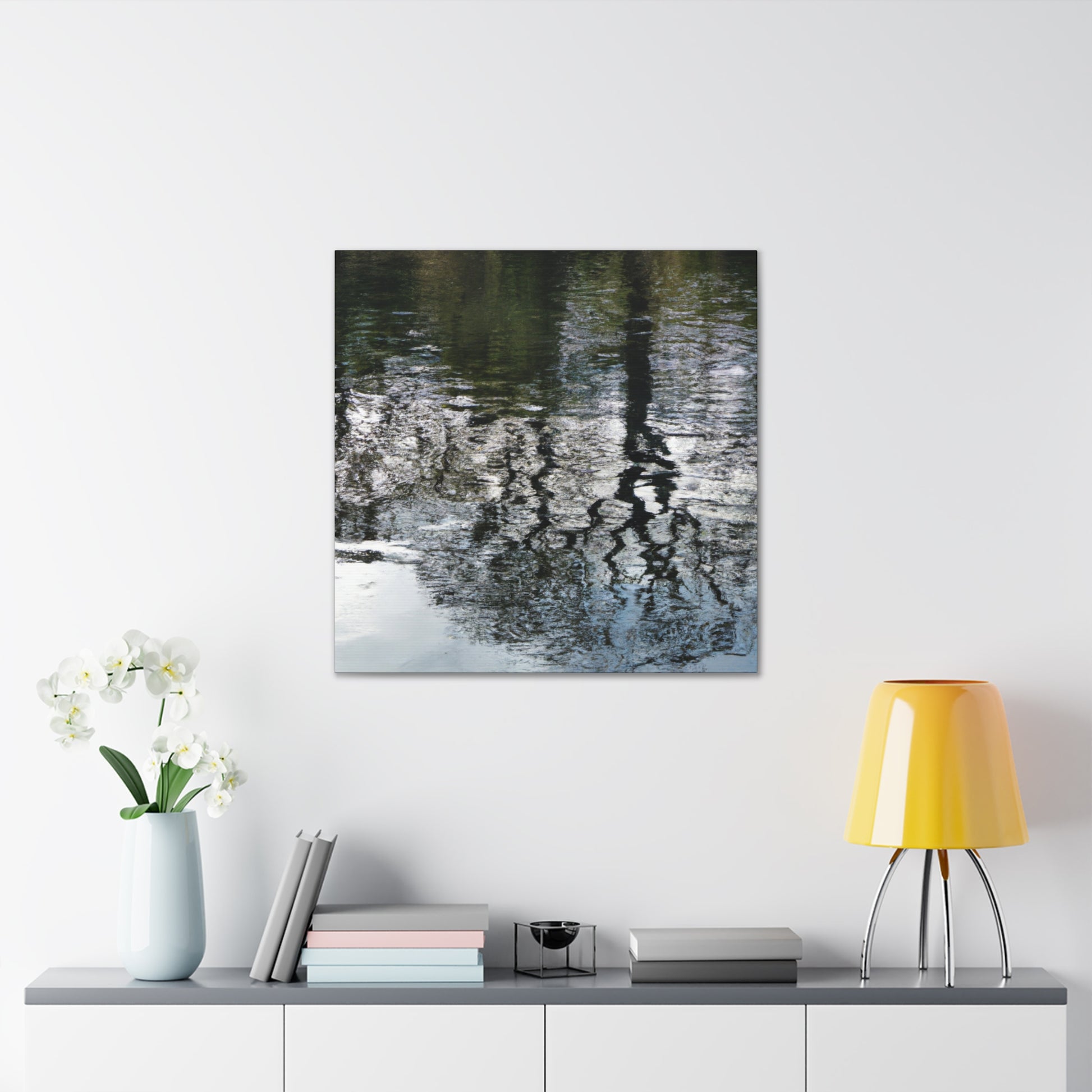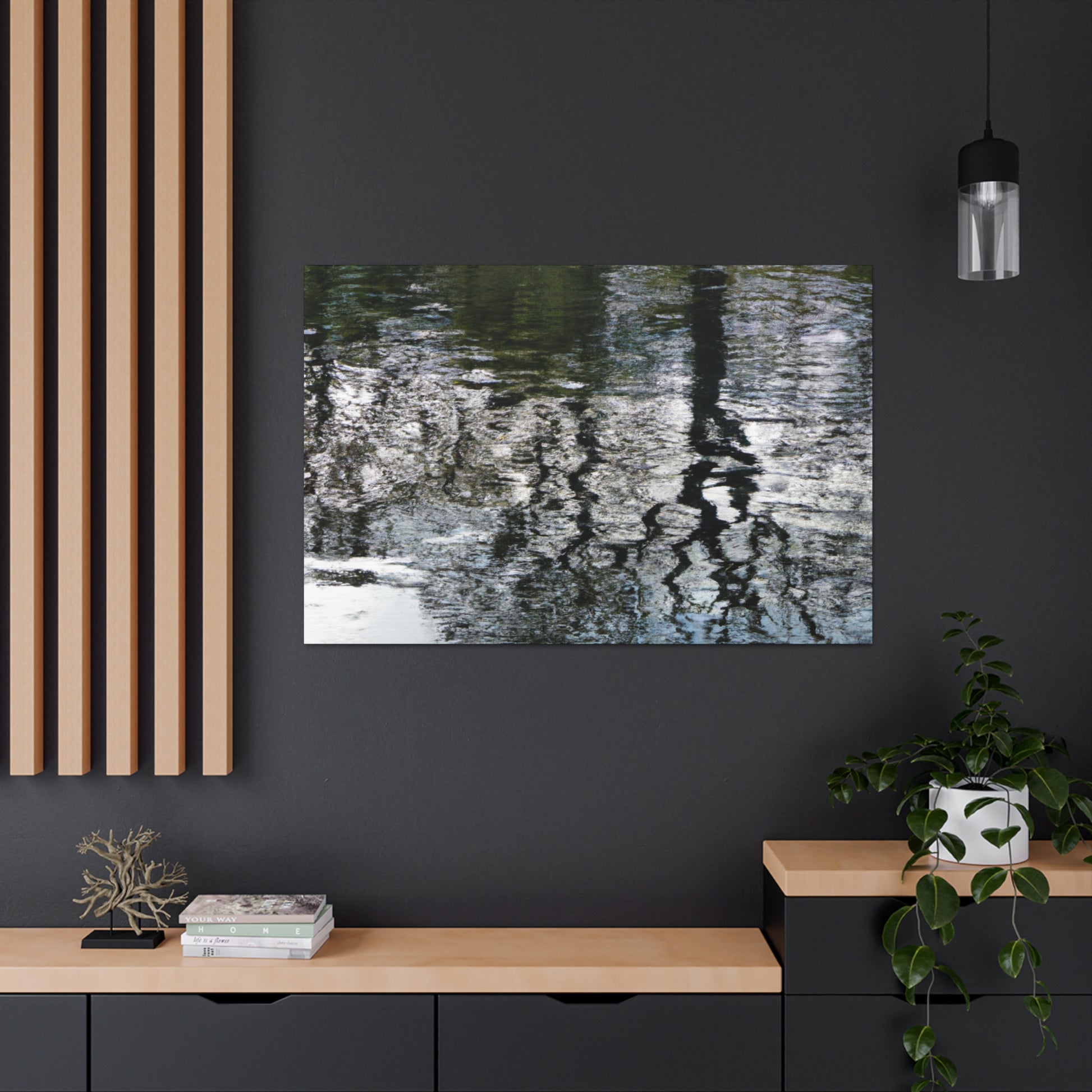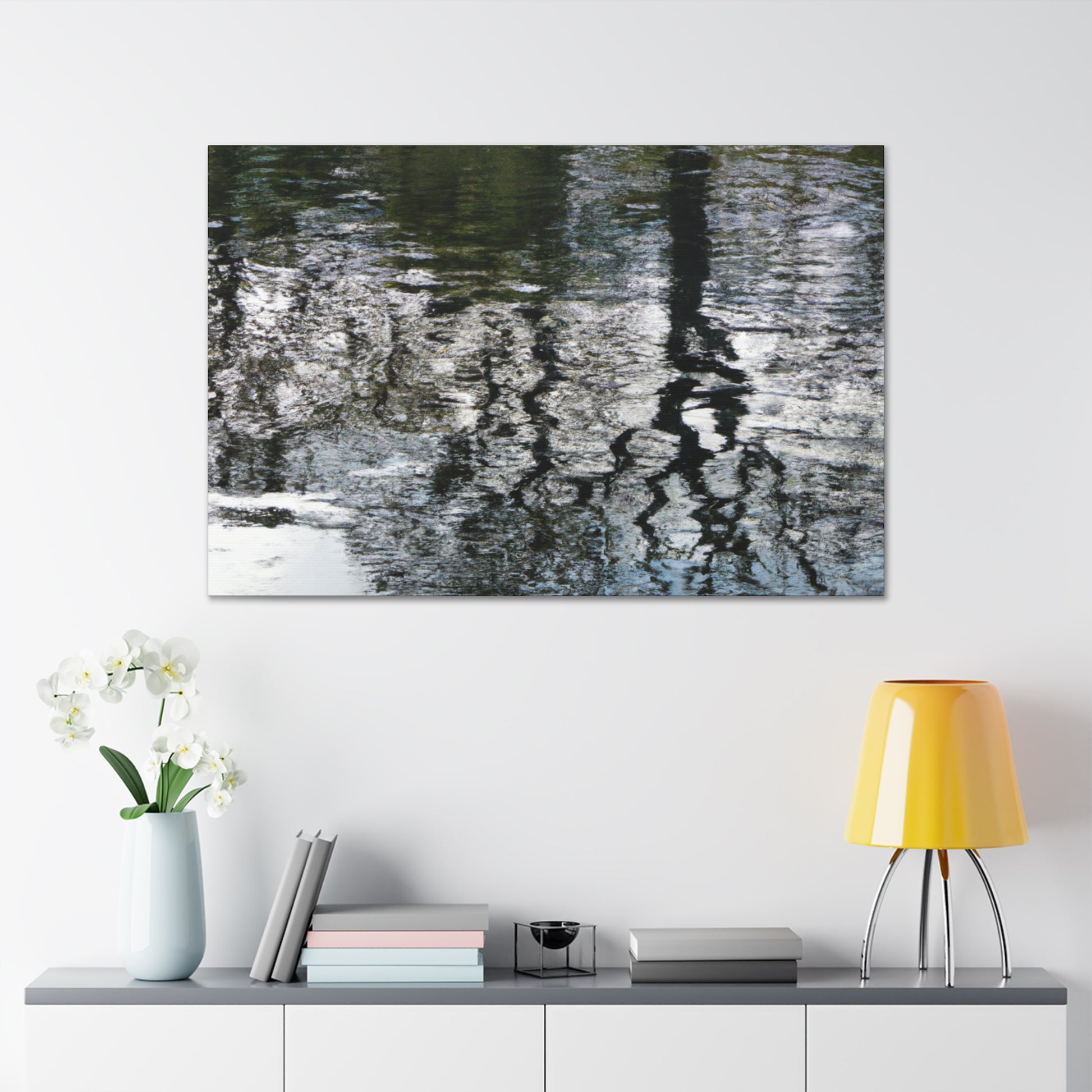 This beautiful canvas captures the watery reflections of light captured through the brushstrokes of a great artist. Vivid colors and softly blended lines create an aesthetically pleasing piece that will bring life to any wall. Whether you hang it in your living room, bedroom or office, this canvas will be sure to leave you in awe. #waterpainting #canvas #art #reflections #light #colors #brushstrokes #wallart #interior #aesthetic #details #greatartist