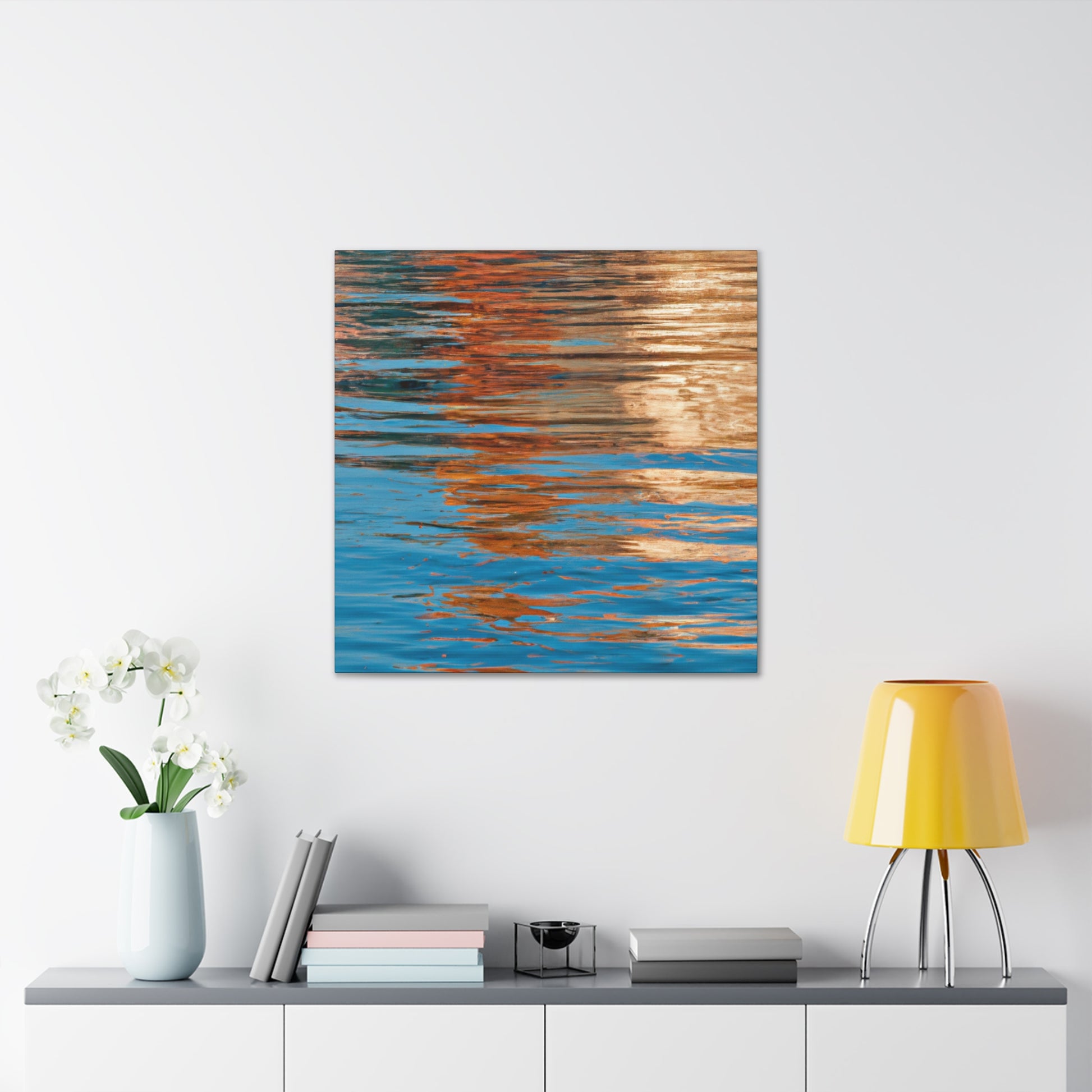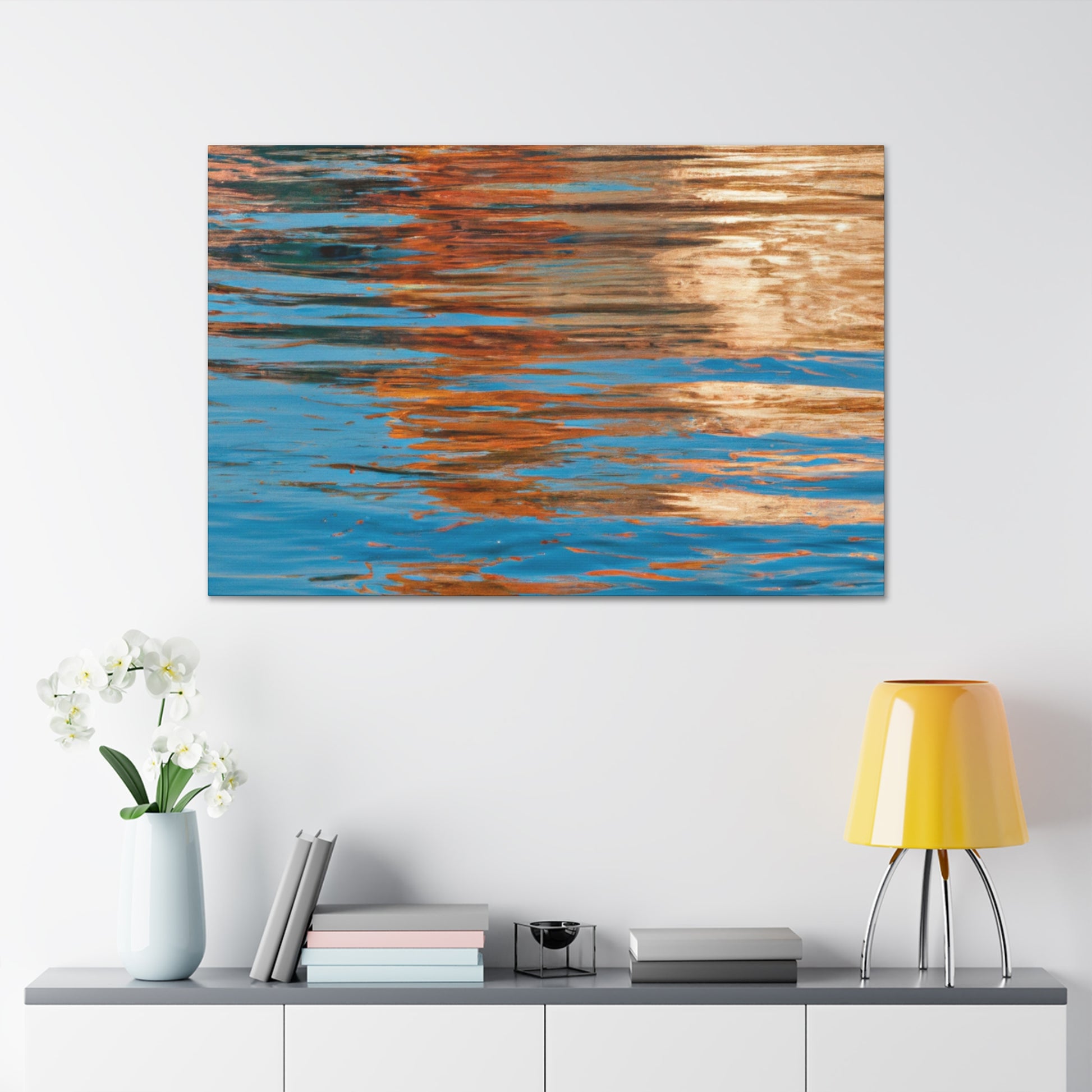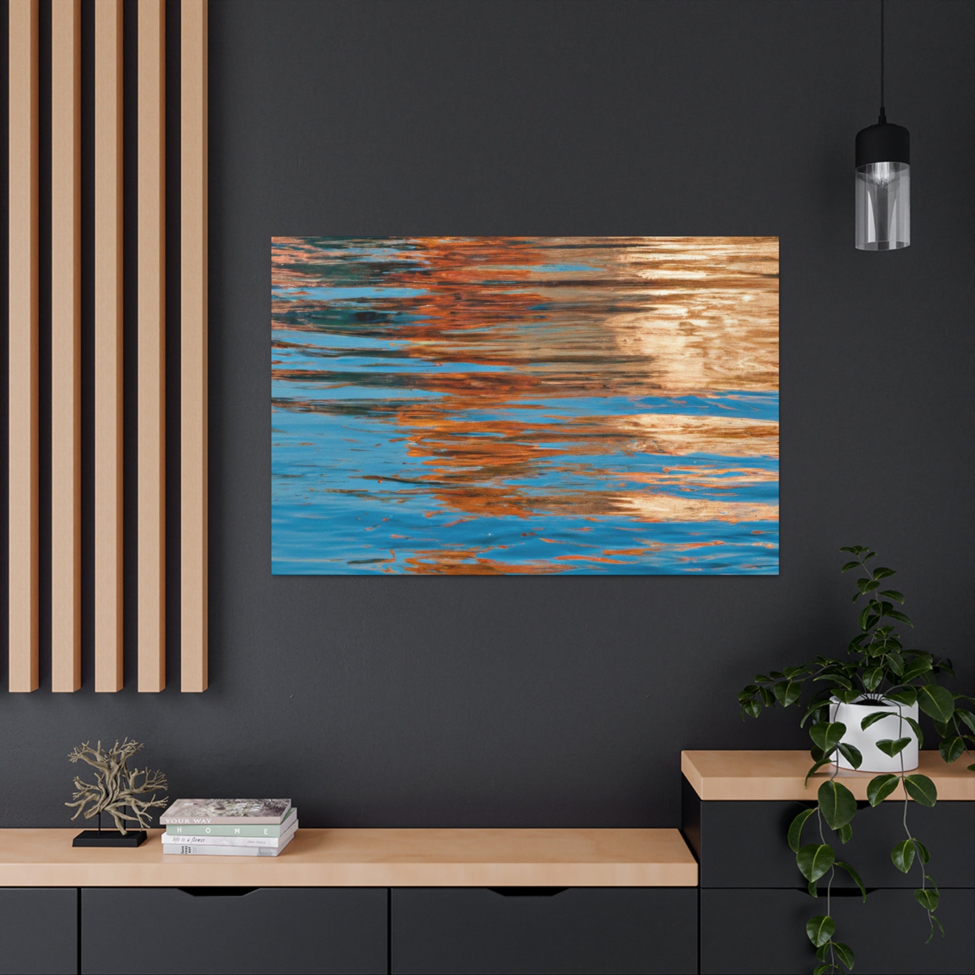 This beautiful canvas displays stunning reflections of light and water. An excellent piece of modern art for your home, this painting encapsulates the imagination and talent of the great artist. Accentuating movement and depth, this canvas is a truly unique addition to your home. #art #canvas #reflection #paining #modernart #light #water #talent #imagination #home #unique