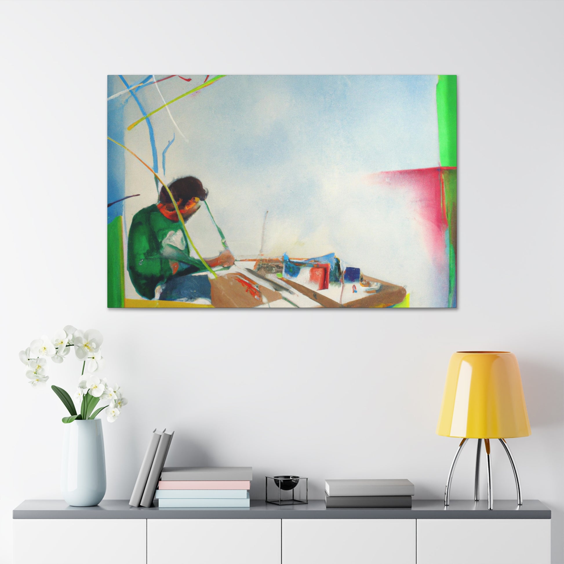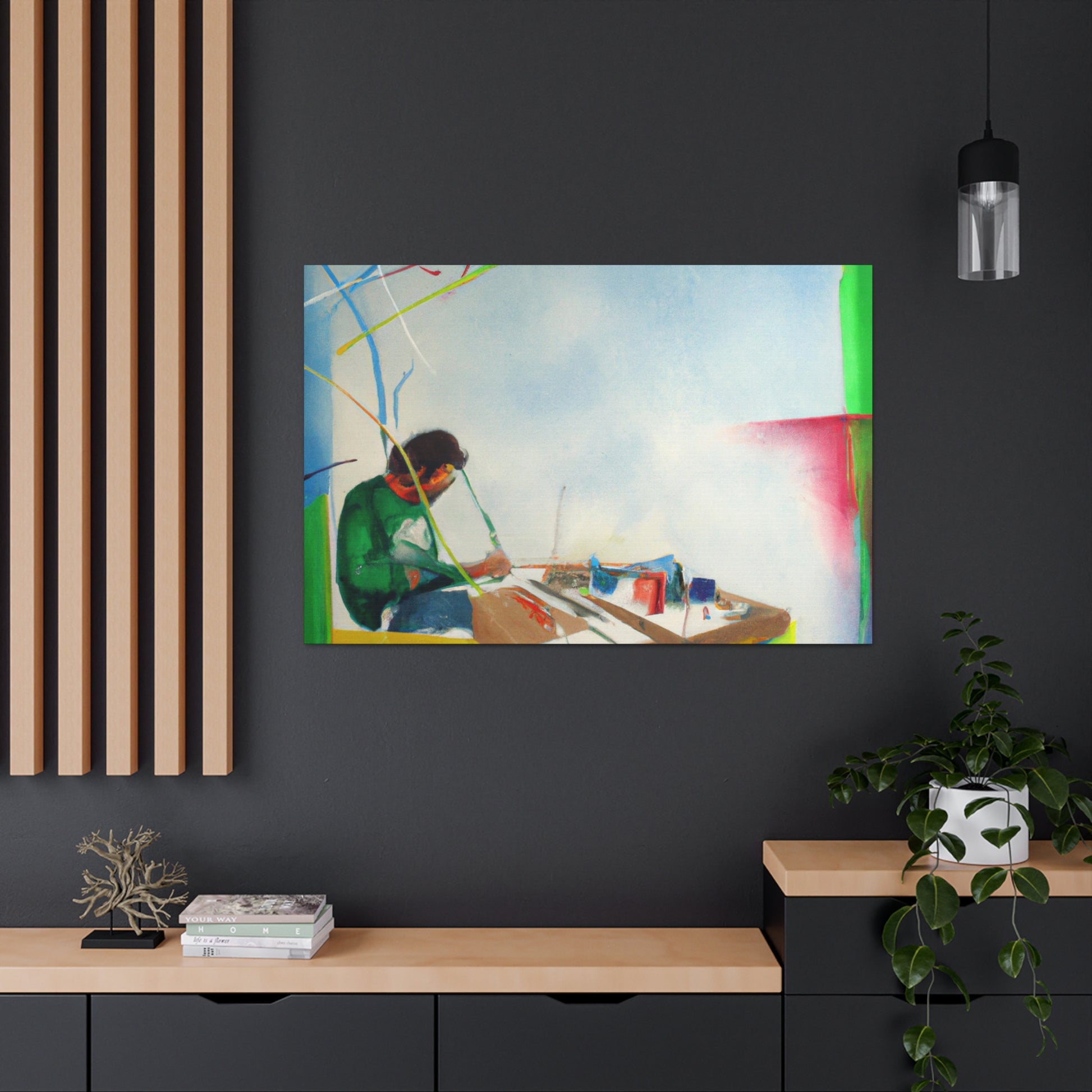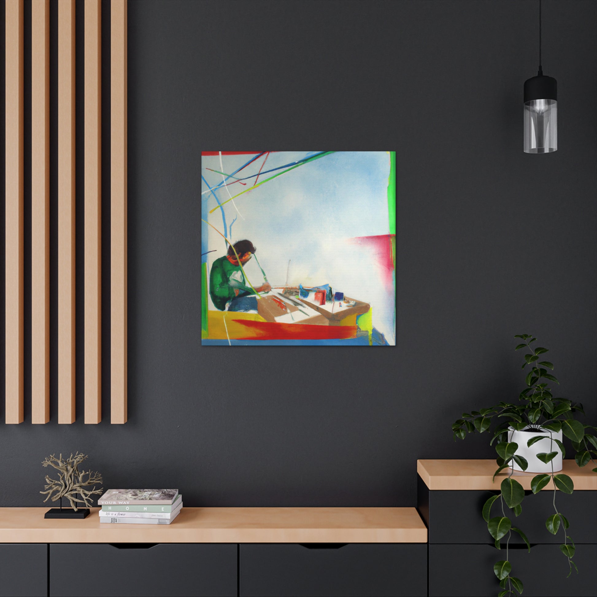 This unique abstract office painting will bring vibrancy and sense of colour to your wall. Created by a renowned artist, this canvas portrays a mix of earthy tones, creating a bright, tropical landscape that speaks to the imagination. The abstract shapes add a modern touch, perfect to liven up any office or home. Invest in this affordable work of art today, add a little colour and make your space come alive! #abstractpainting #artwork #canvaspainting #officepainting #homedecor #affordableart #abstractshapes #tropicaldesign #renownedartist #uniquecanvas #modernartand