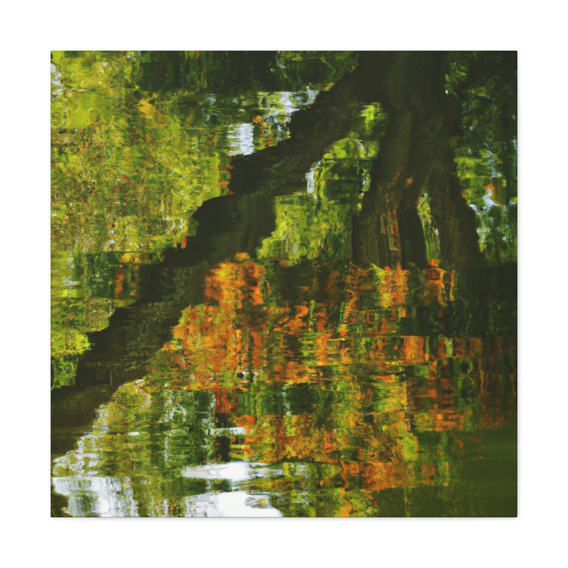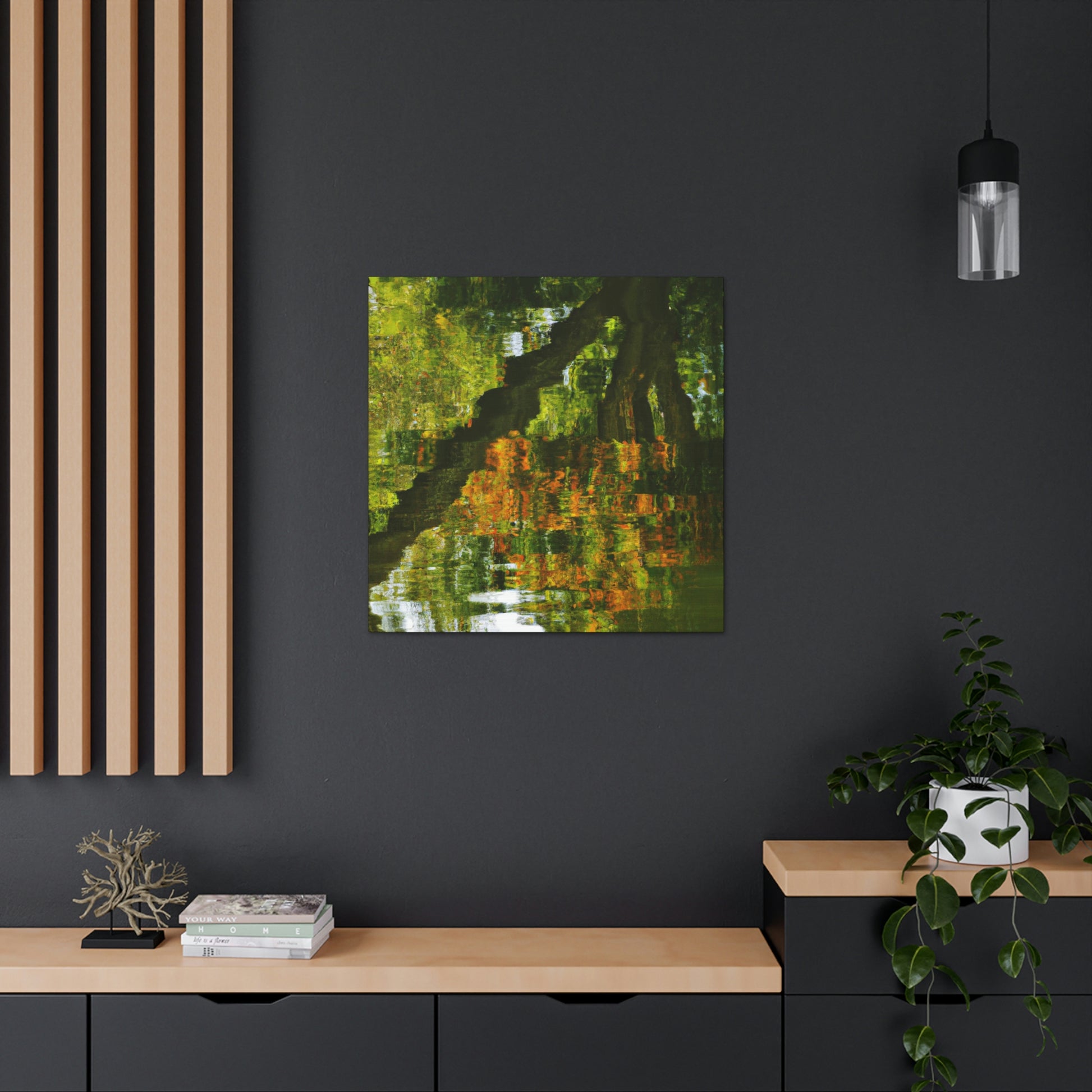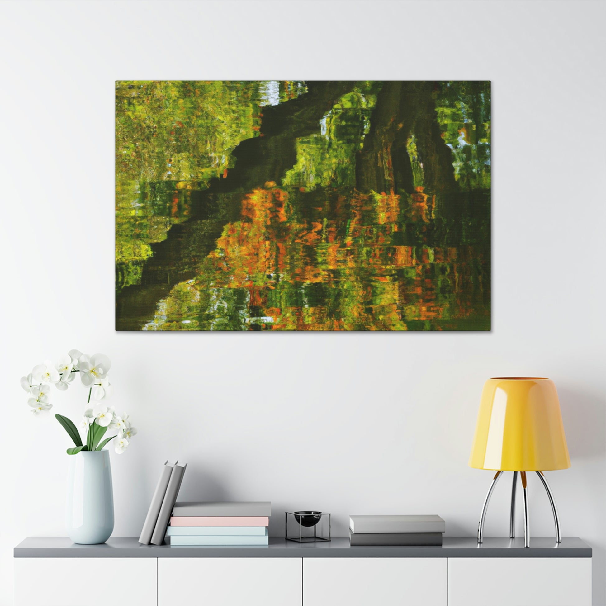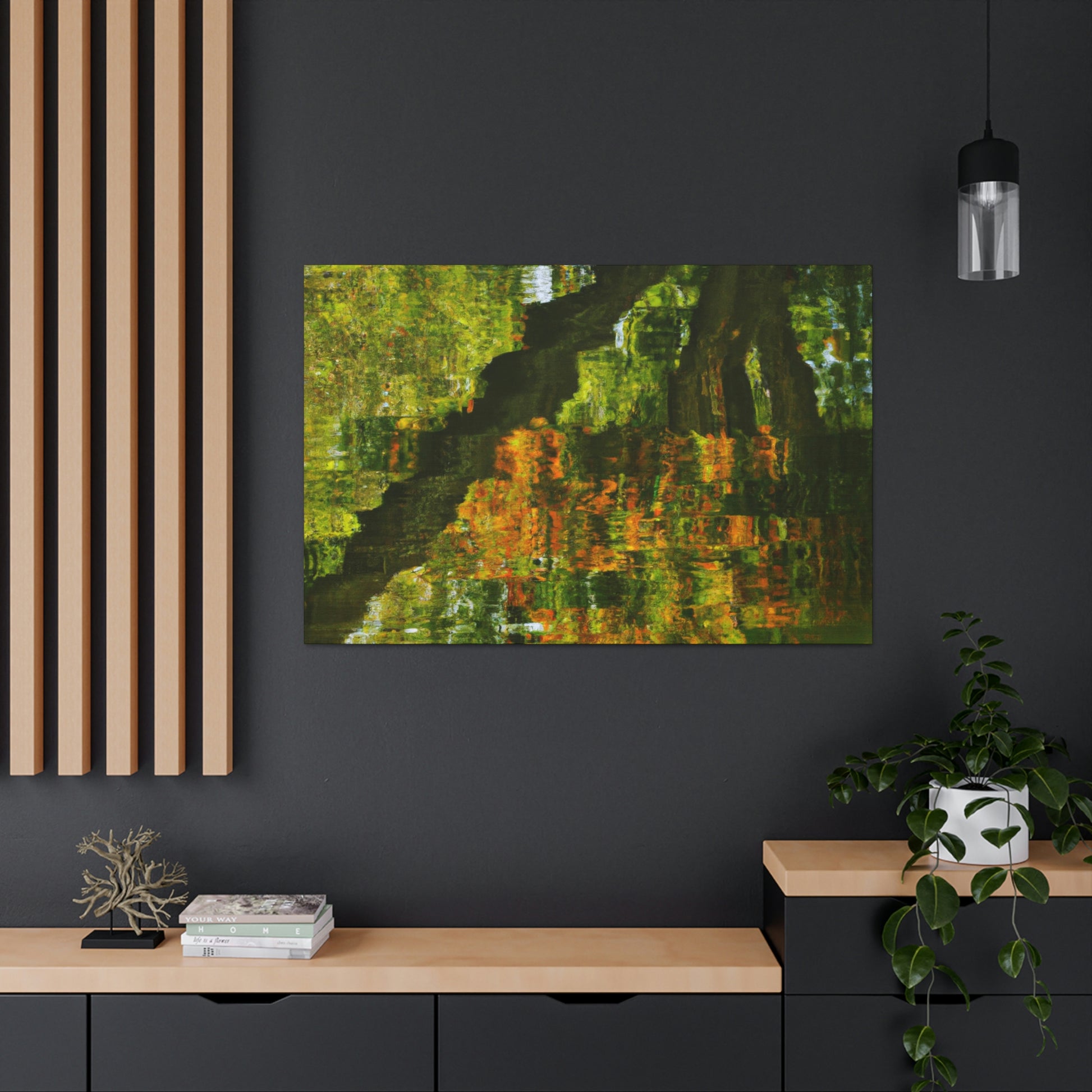 This distinctive canvas is perfect for large walls, featuring a beautiful reflection and water painting. This artwork is embellished with intricate strokes of color and light, giving it a truly unique character. Add a touch of grandeur to your space and make a statement with this mesmerizing painting. #artwork #canvas #painting #reflection #waterpainting #interiordesign #homedecor #statementpiece #swirlingcolors #intricatestrokes #lightandcolor #and