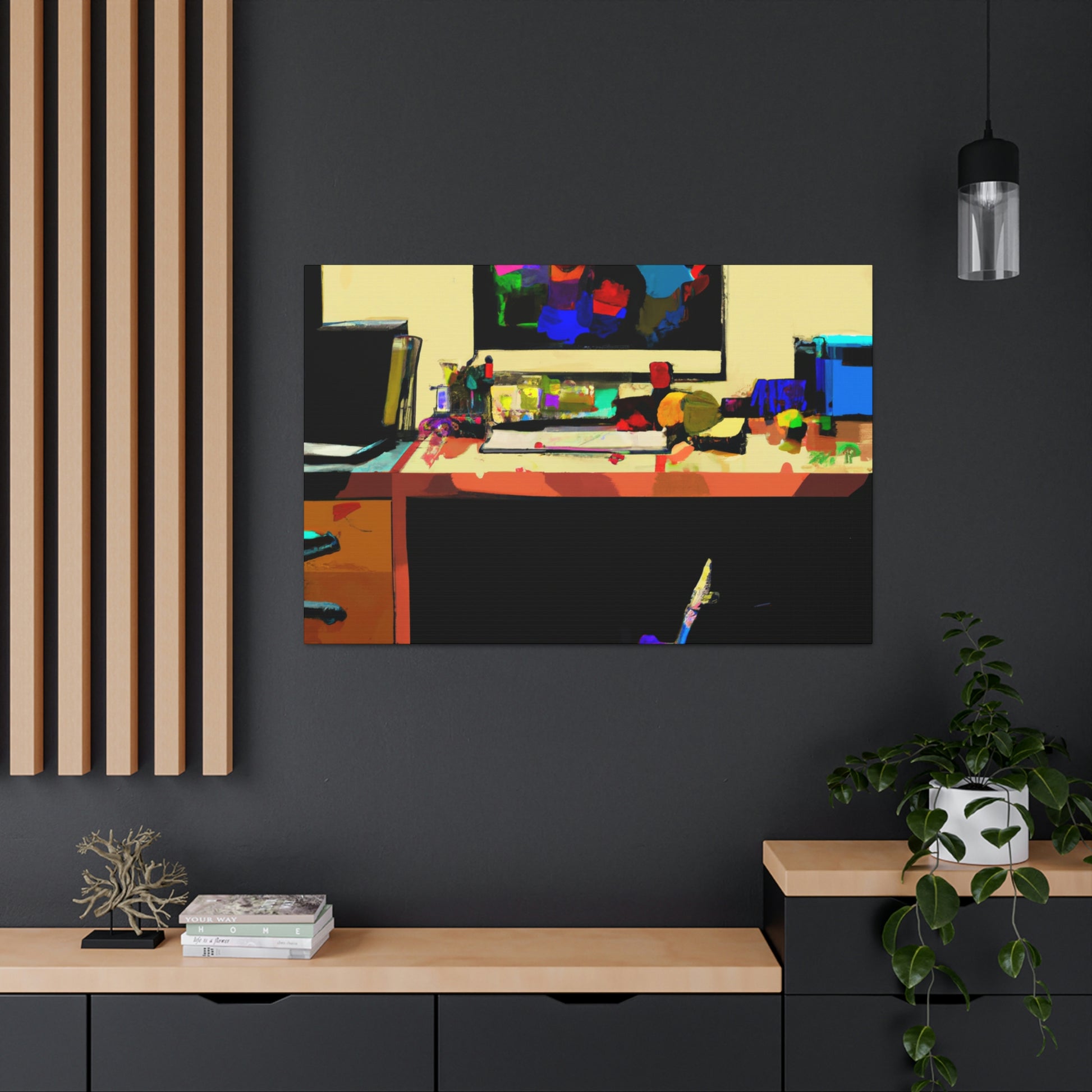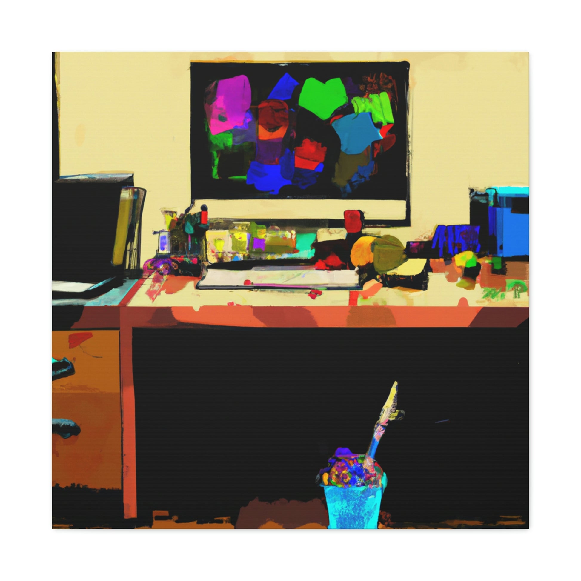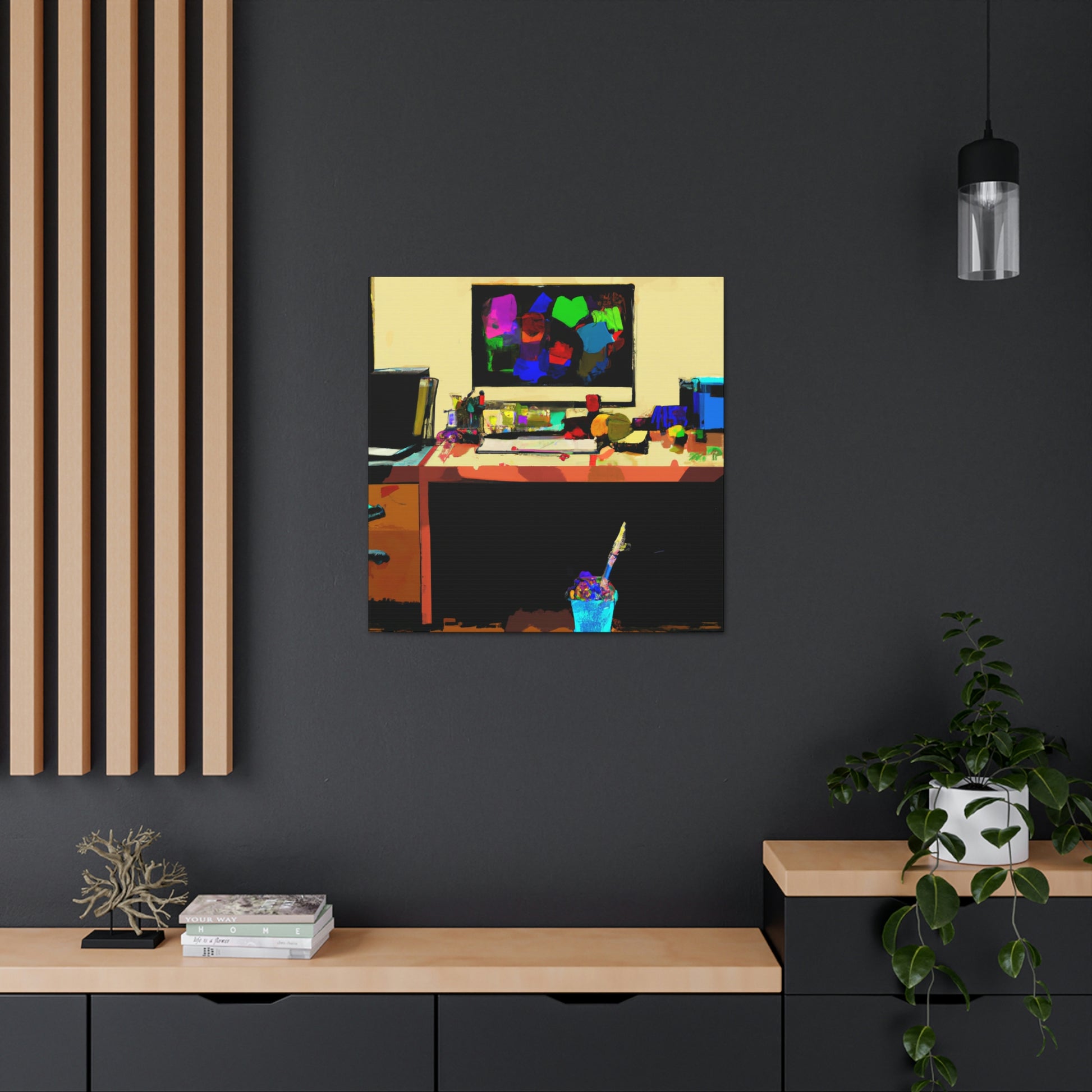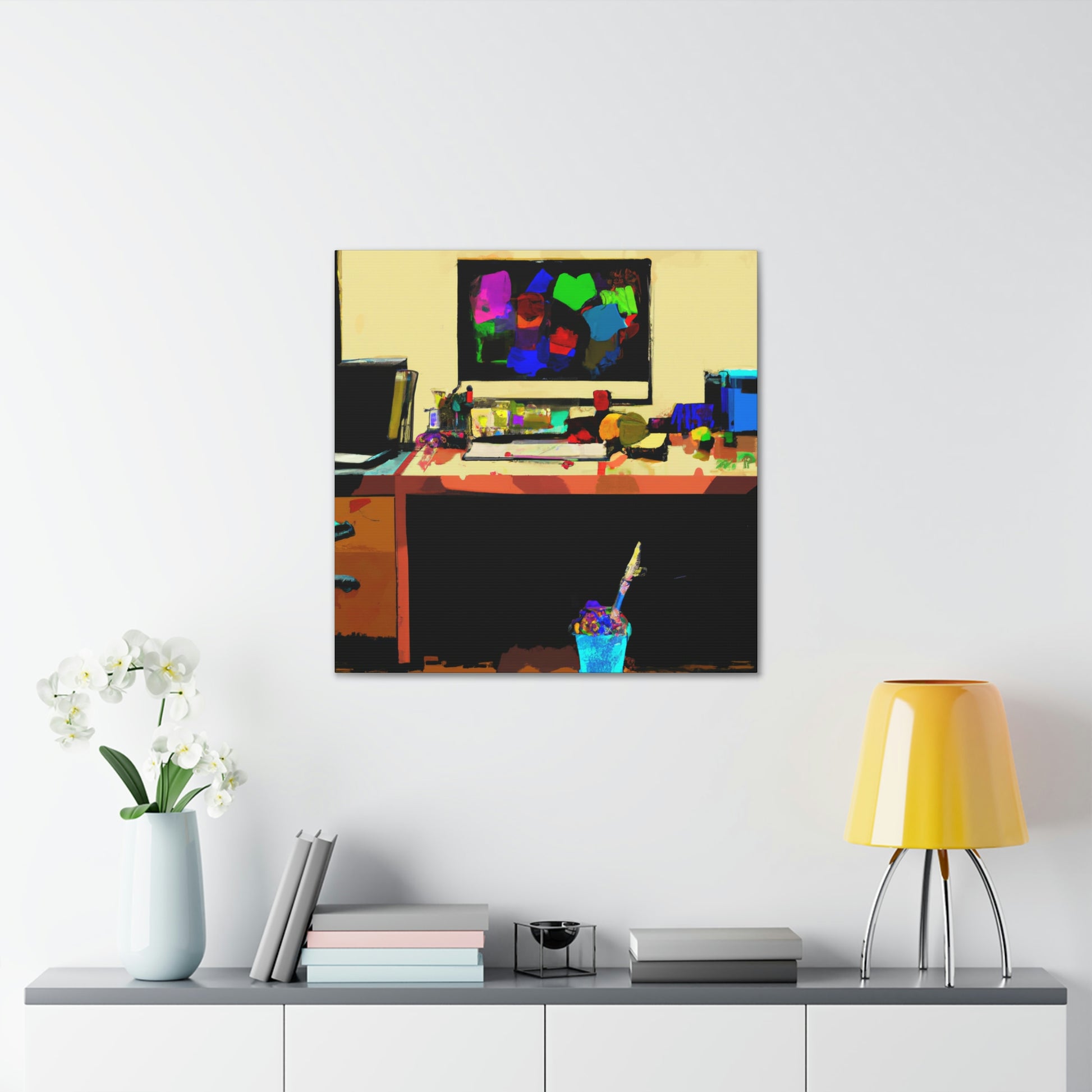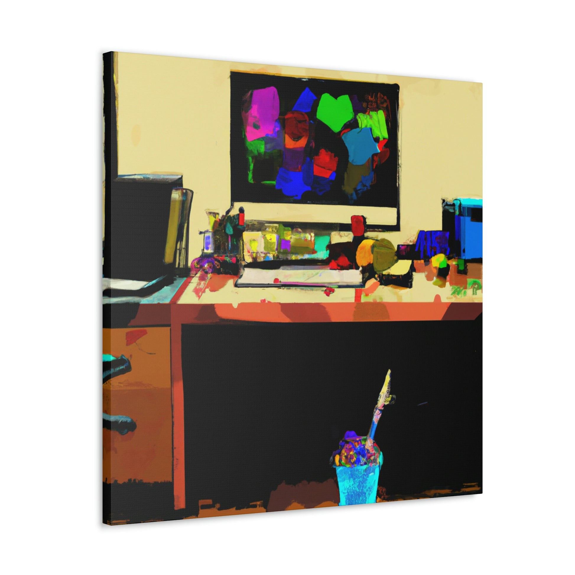 This abstract office painting depicting the modern and contemporary life of a great artist will enliven the walls of your workspace. It is a vibrant mix of colours and shapes, making it a beautiful conversation piece. The artwork is hand painted organically with acrylics, creating unique and stunning visual effects. This canvas is sure to take your office to the next level of stylish sophistication. #abstractart #modernart #contemporaryart #abstractpainting #officepainting #artlover #artistlife #officeart #wallart #workspace and #homedecor