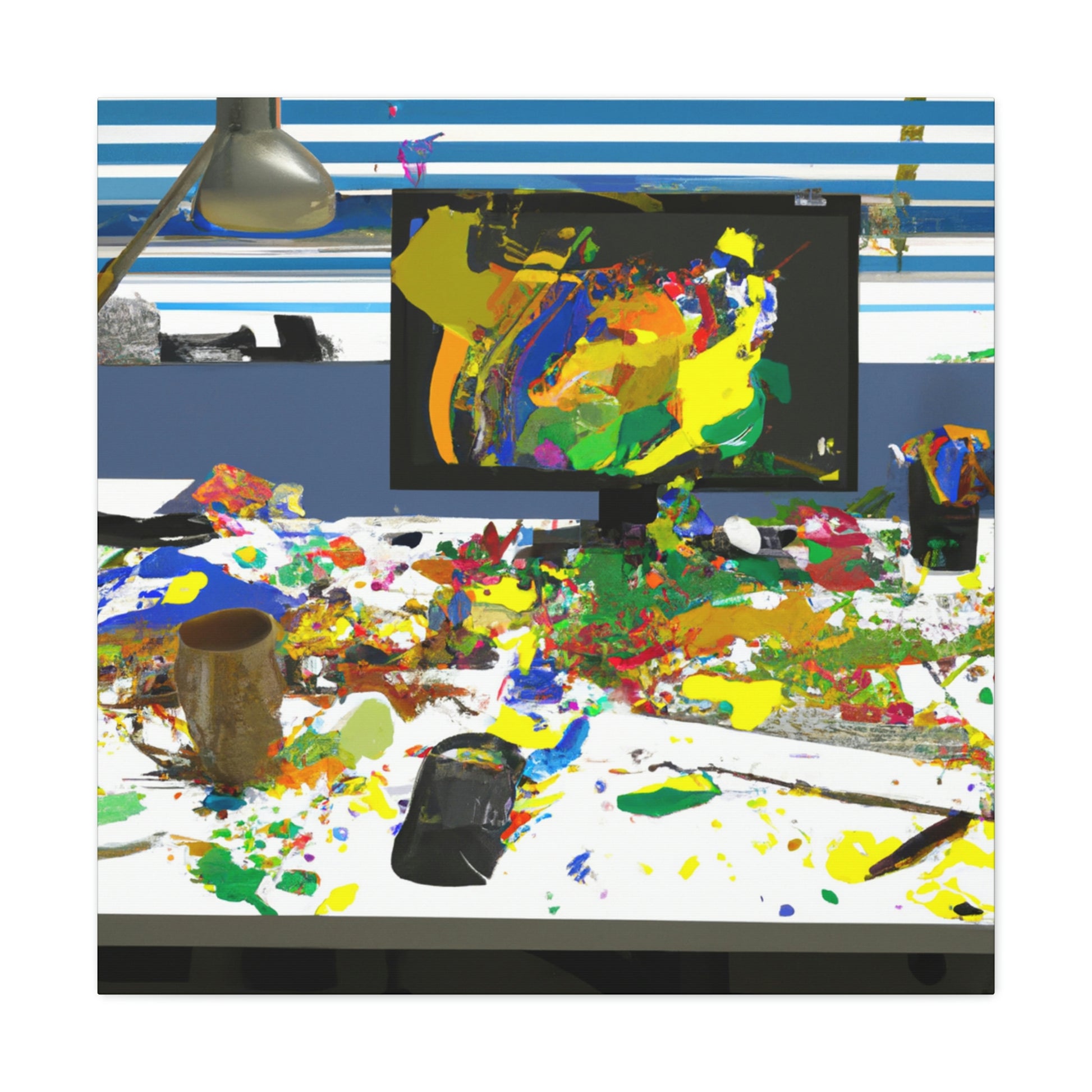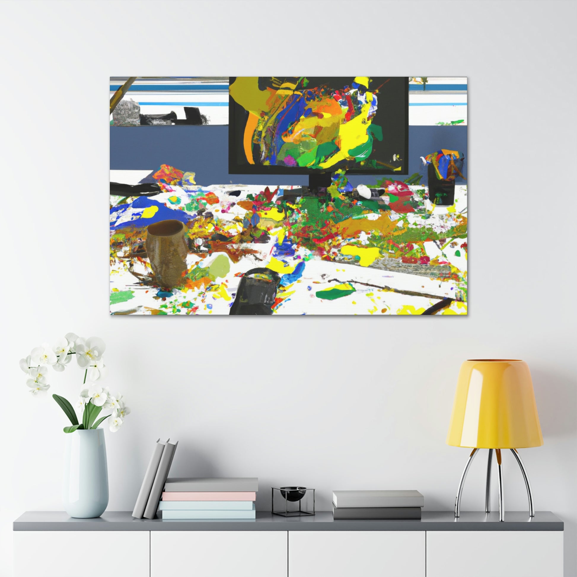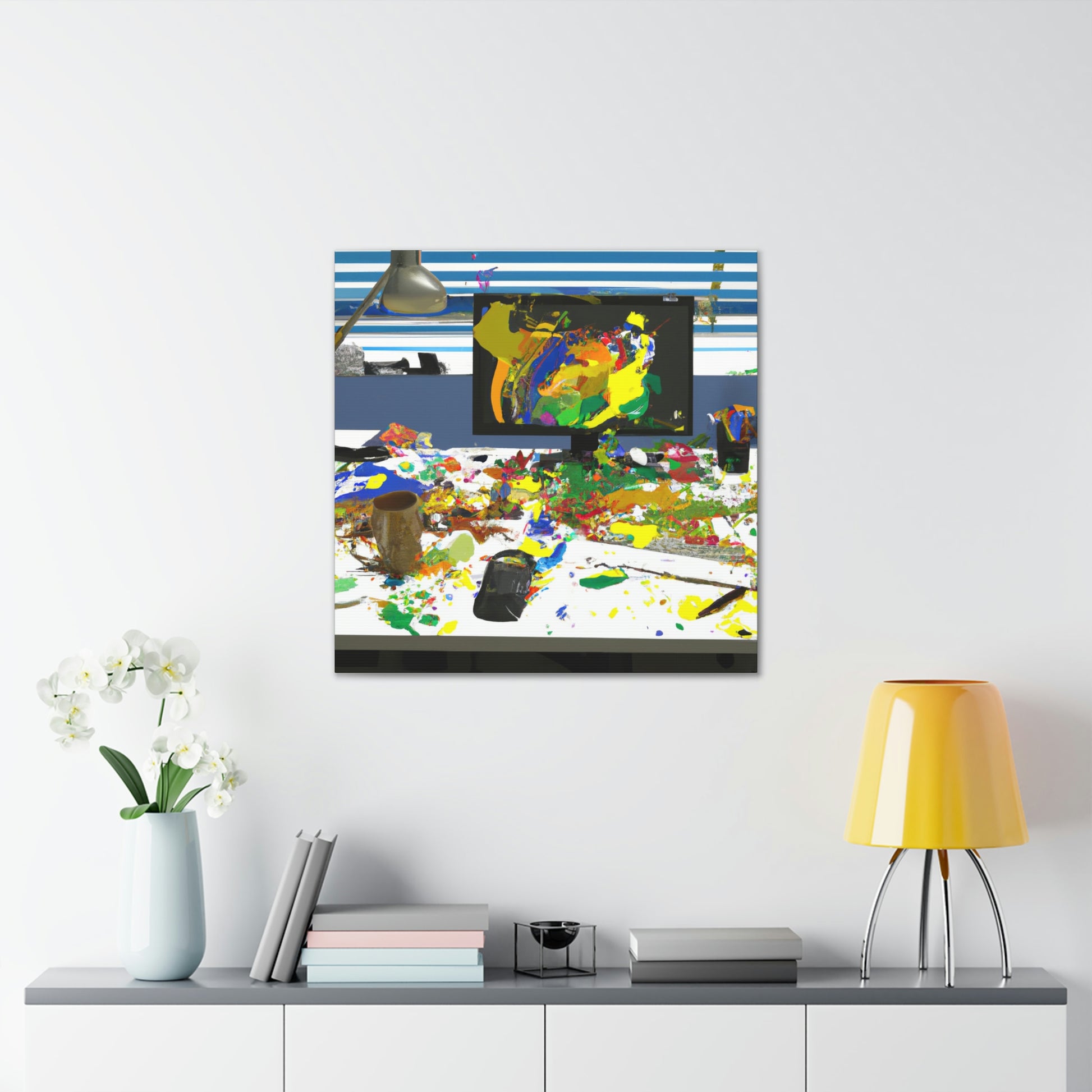 This original abstract painting is sure to add a statement piece to any office. Adorned with bold, bright colors and designed to draw the eye, this canvas reflects the creativity and energy of a great artist. Perfect for any work space, the framed piece will create a talking point and draw the eye. #abstractpainting #artwork #officeart #colorful #statementpiece #boldcolors #originalart #greatartist #abstractart #canvasart and #framedart